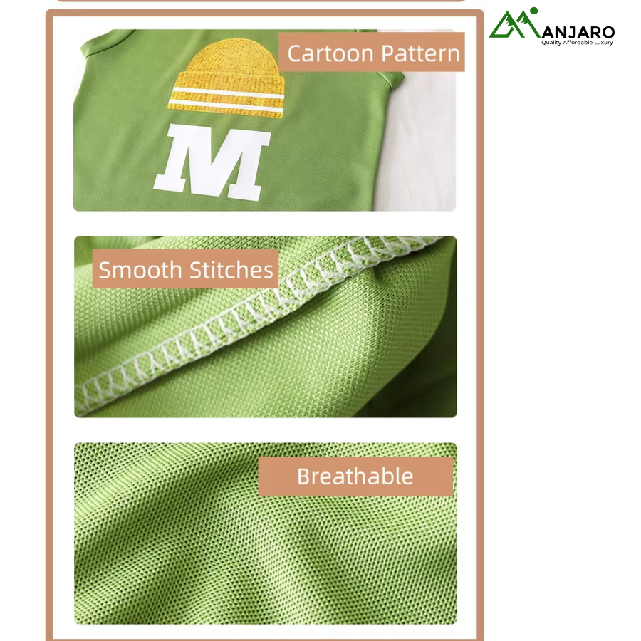 Made from 100% soft polyester with a refined worsted texture, the set delivers lightweight breathability, quick-drying performance, and durability suitable for active toddlers. The cute cartoon pattern brings playful charm, while the smart casual design makes this set easy to dress up or down.