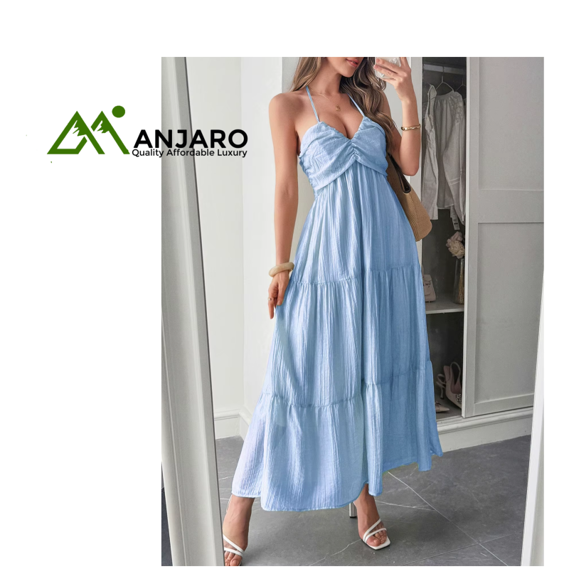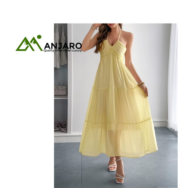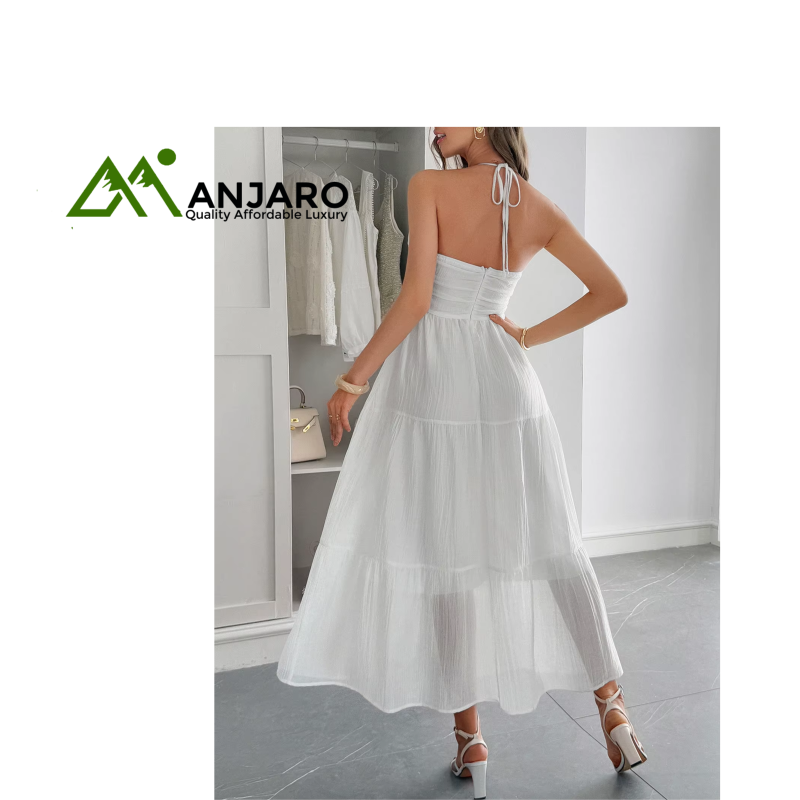 Effortlessly chic, the D&M Sleeveless Halterneck Midi Dress blends modern romantic style with casual summer wearability. Made from soft, breathable Lyocell fiber with a light polyester lining, this dress delivers comfort with a naturally flowing drape. Its halter neckline and open-back design create an elegant silhouette, while the semi-transparent finish adds subtle allure. The A-line cut and regular fit provide an easy yet refined shape—perfect for beach evenings, brunches, or outdoor parties.