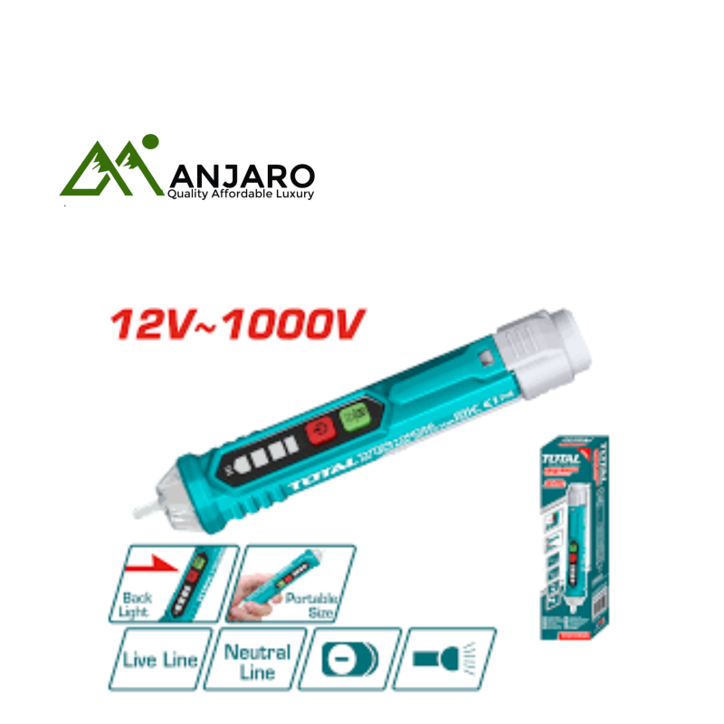 Ensure electrical safety with the Total THT29100026 AC Voltage Detector, a compact and efficient tool designed to detect voltage without direct contact. Operating within a wide range of 12V to 1000V AC, this tester is ideal for electricians, technicians, and DIY users. Featuring an LED indicator, sound alerts, and a built-in flashlight, it helps you identify live wires quickly and safely. Its pocket-sized design makes it perfect for on-the-go diagnostics at home, in workshops, or on job sites.