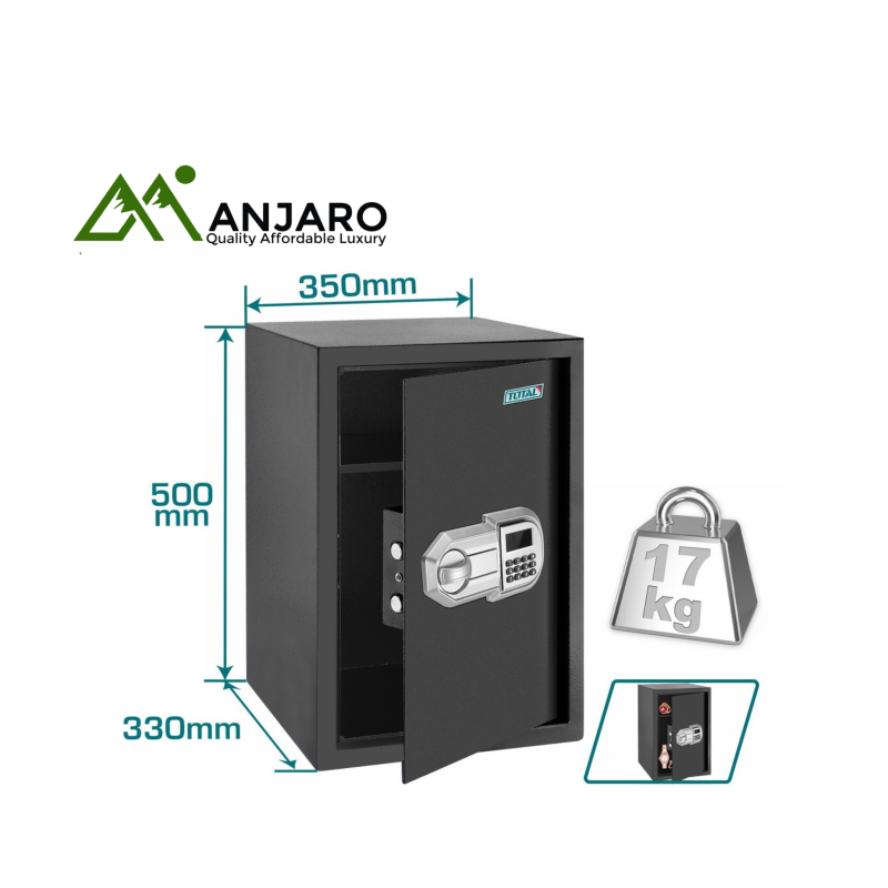 The Total TESF5001 Electronic Safe provides reliable and secure storage for your valuables, documents, and personal belongings. Designed with a digital keypad system, this compact yet durable safe offers quick access with a user-set PIN code, along with manual override keys for backup. Whether at home, in the office, or a small business, it’s an ideal solution for safeguarding cash, jewelry, passports, and other essentials.