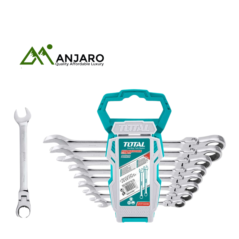 The Total THT102RK586 8-Piece Flexible Ratchet Spanner Set is engineered for professionals who demand precision, durability, and accessibility in tight spaces. This premium set includes 8 spanners ranging from 8mm to 19mm, each crafted from tough chrome vanadium steel (Cr-V) for exceptional strength and longevity. The 180° rotating flexible heads let you work at multiple angles, making it perfect for confined or awkward areas. With a smooth ratcheting mechanism that reduces hand fatigue and boosts productivity, this spanner set is ideal for mechanics, technicians, and serious DIY users who want a tool that adapts to every challenge.