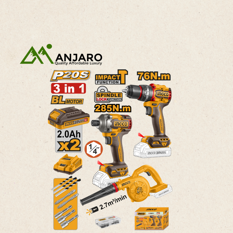 The Ingco COSLI250182 Cordless Combo Kit is the ultimate all-in-one power tool solution for professionals and DIY enthusiasts. This powerful set includes a 20V Impact Drill with 76Nm torque, a 20V Impact Driver with 285Nm torque, and a high-performance cordless blower—giving you the versatility to drill, drive, and clean with ease. Equipped with two rechargeable 20V lithium-ion batteries, this kit ensures uninterrupted work time and maximum convenience. Compact, durable, and designed for high-performance tasks, it’s perfect for construction, carpentry, mechanical repairs, and workshop maintenance.