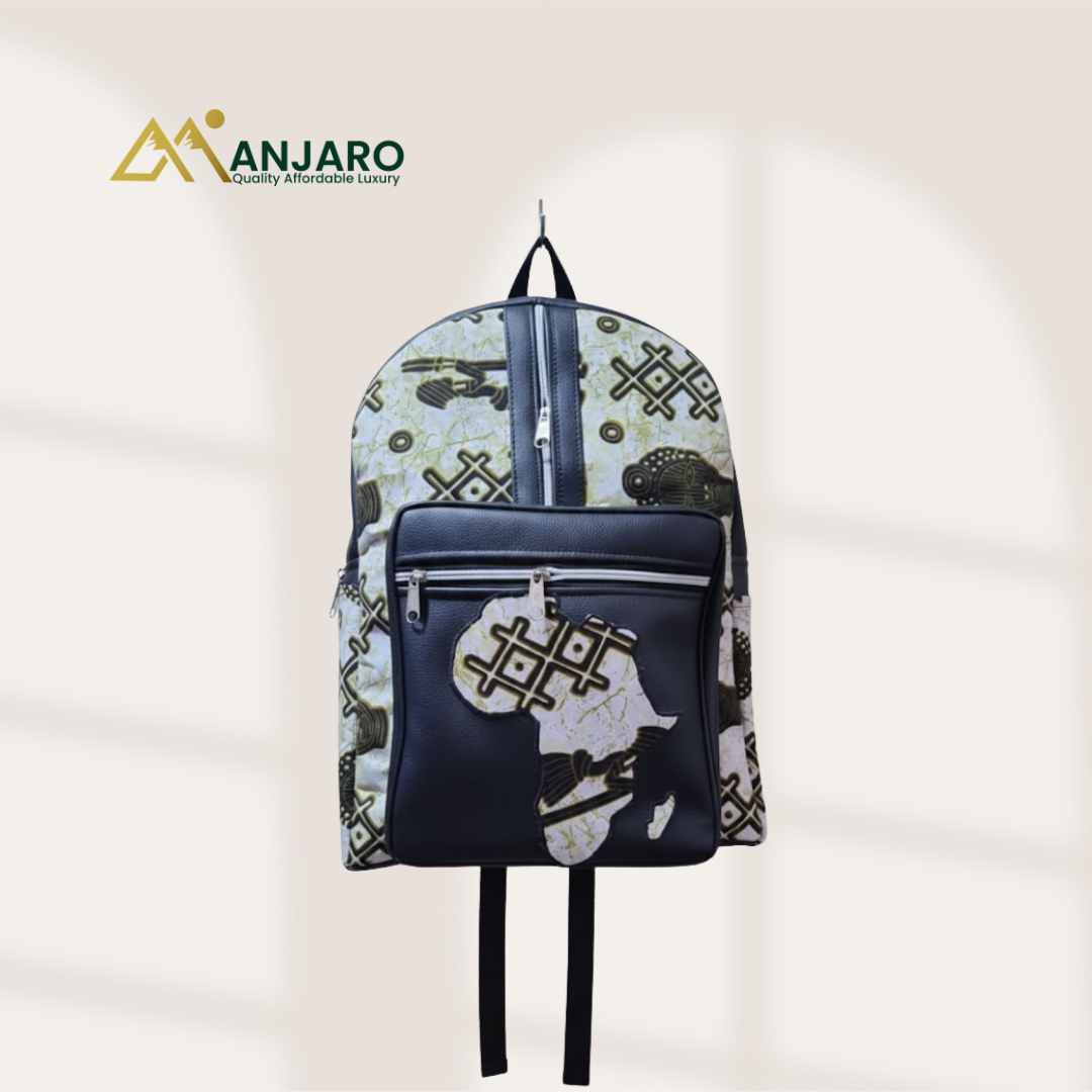 The Artisan Heritage Africa Map Backpack is a premium carrying solution designed for the modern professional or student who values cultural identity and sophisticated design. Crafted by Manjaro, this bag features a striking ivory-toned textile body adorned with intricate traditional Adinkra and geometric motifs. The front is dominated by a high-grade black pebbled-leather pocket, featuring a hand-applied Africa map inlay that showcases the same rich cultural patterns found throughout the bag.