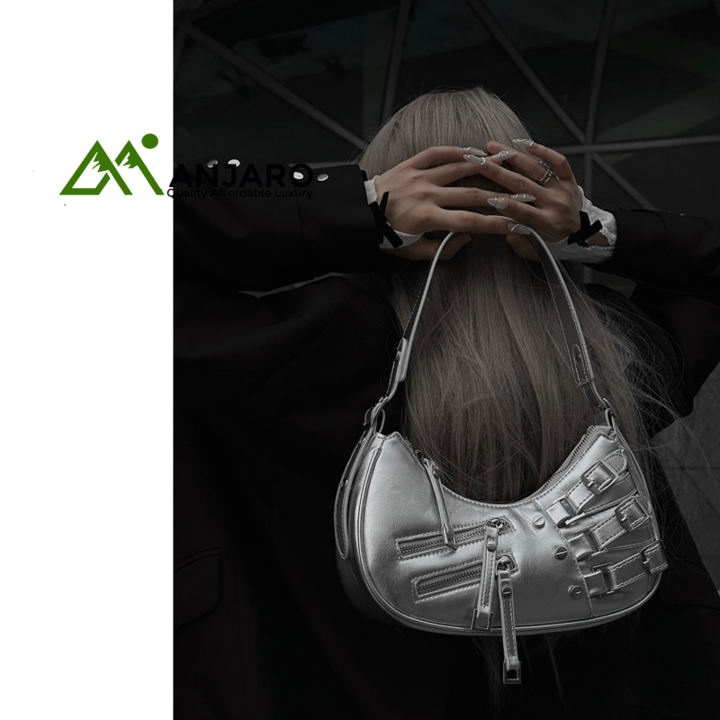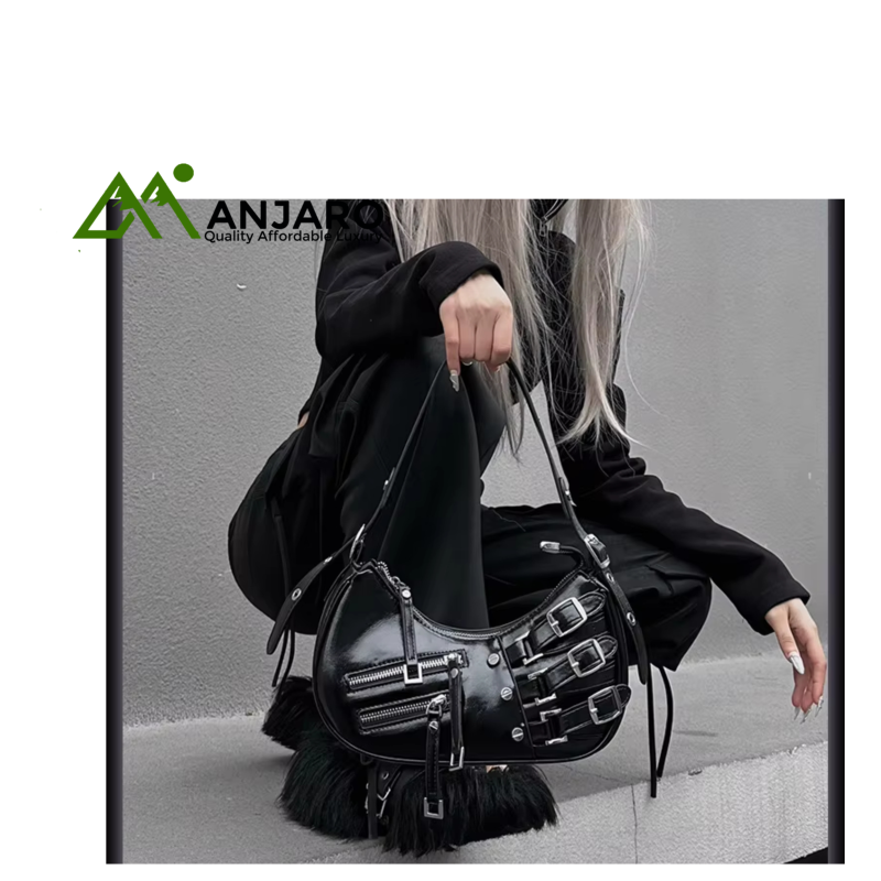 Add an edgy yet refined touch to your outfit with the Black Bright Face Niche Design Shoulder Retro Spice Motorcycle Bag. This underarm bag takes cues from American motorcycle style with its glossy PU finish, chain and button detailing, and bold silhouette.