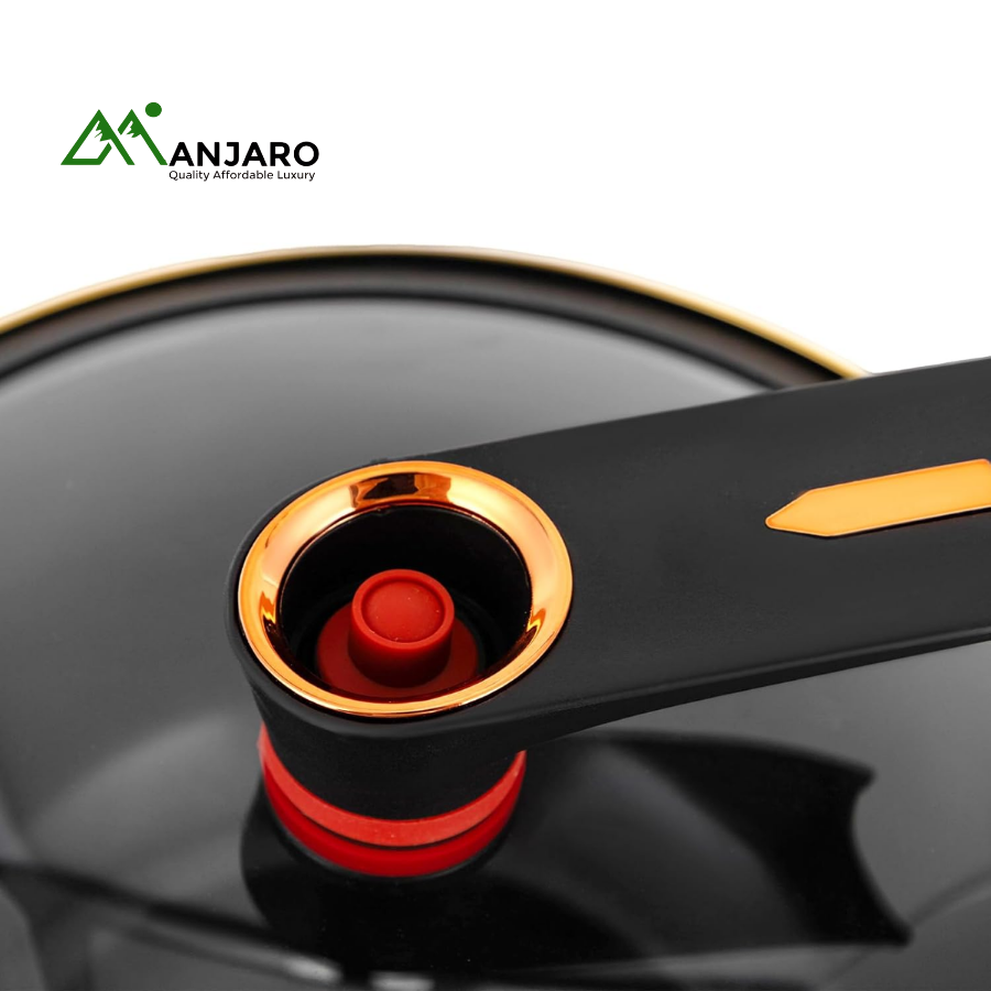 Handles: Features Heat-Resistant black side handles and a top lid handle with metallic accents for safe handling.