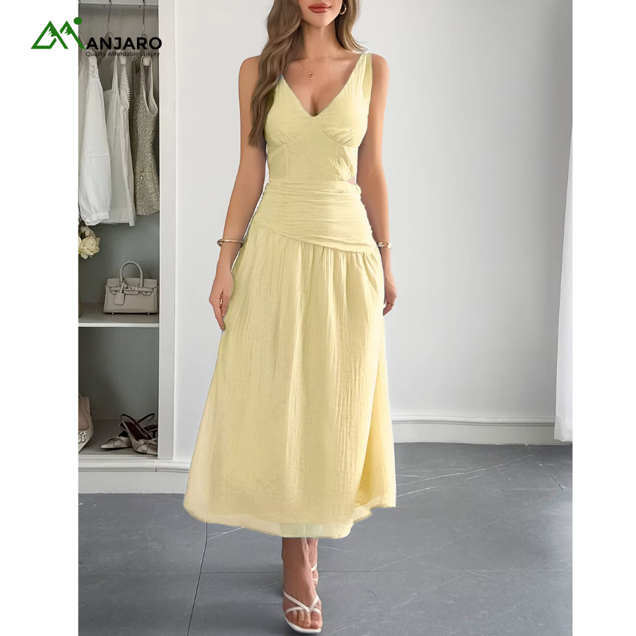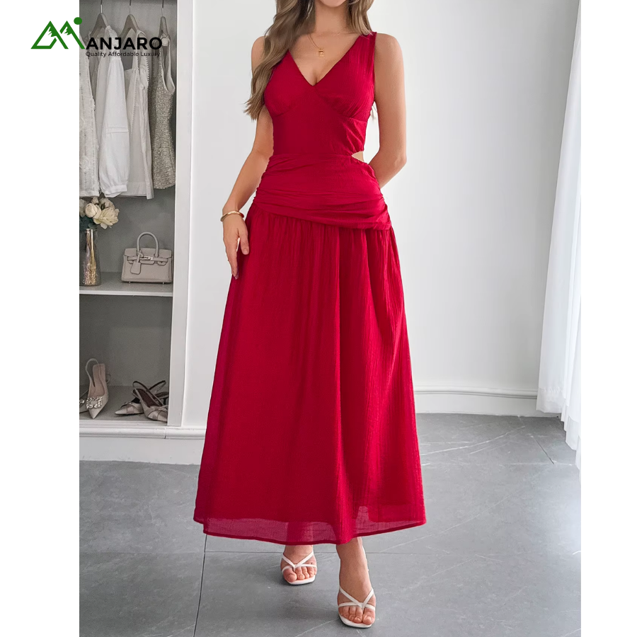 The V-neckline and sleeveless silhouette bring a light, airy feel, while the hollow-out cut-out detailing adds a subtle touch of allure. Its loose, flowy fit ensures maximum comfort and movement, flattering every figure with ease. The knitted fabric and natural waistline create a relaxed yet refined aesthetic, making this maxi dress an essential wardrobe staple for the modern woman.