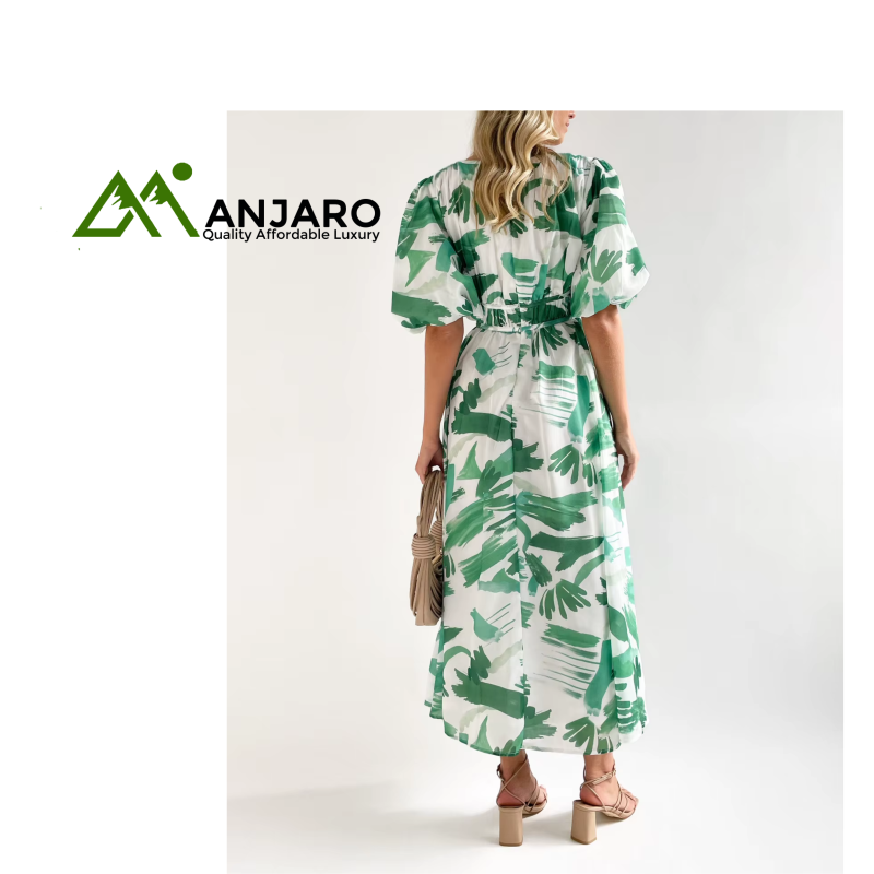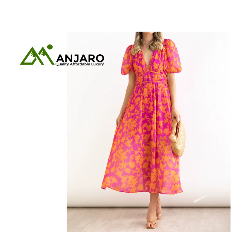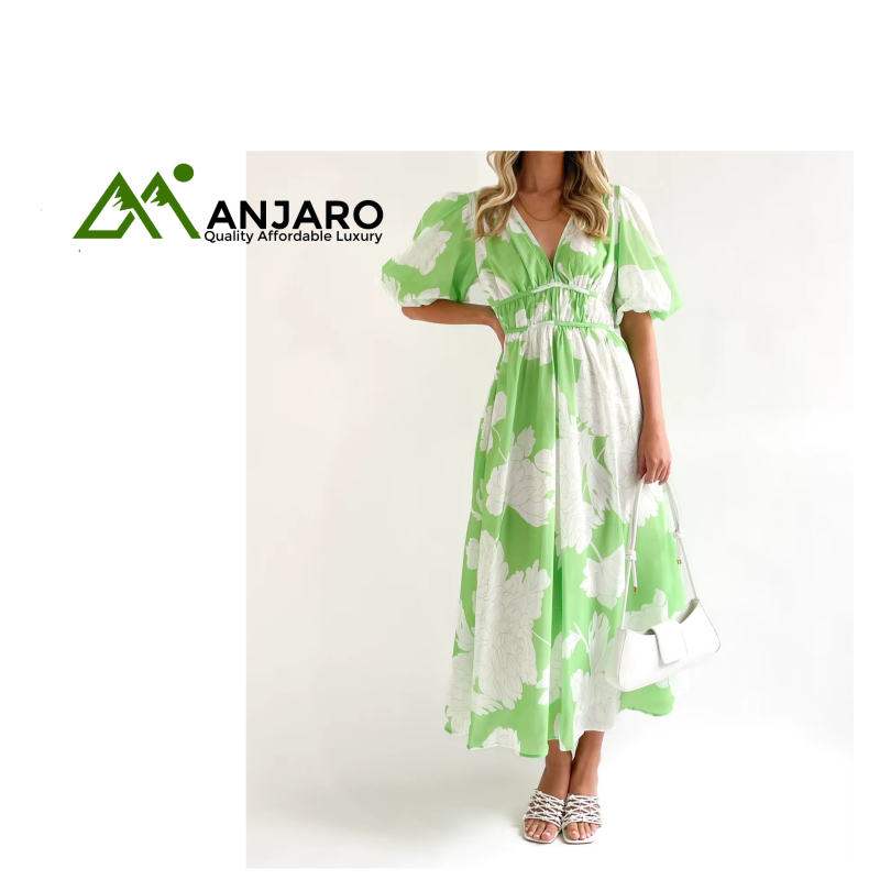 Design Details: Elegant V-neckline, playful puff sleeves, and sophisticated pleated design.