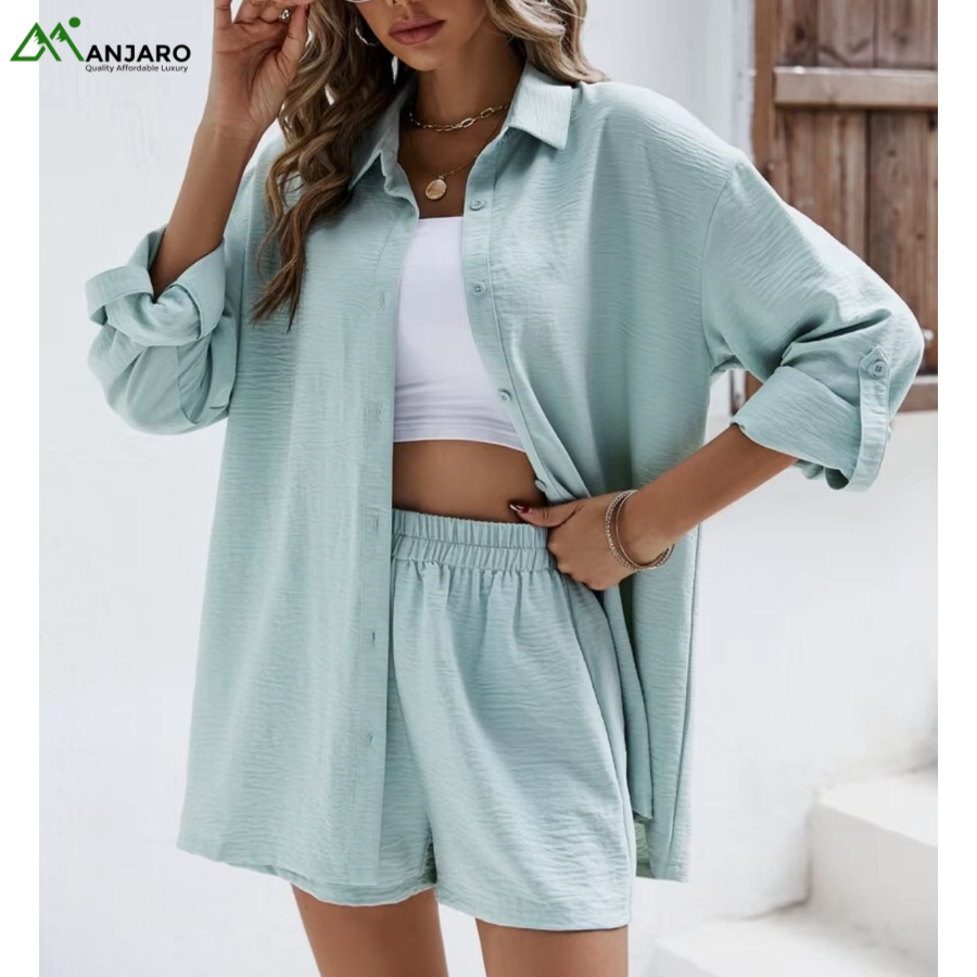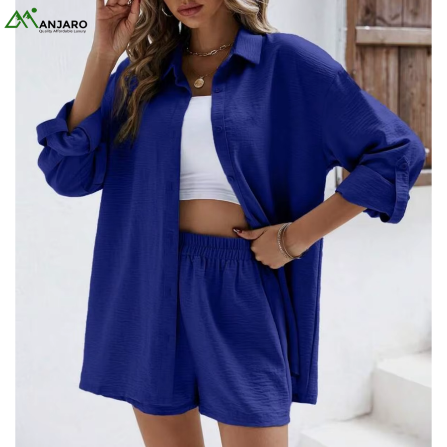 Stay effortlessly stylish with the D&M Women’s Fashion Casual Suit Set, designed for women who love comfort and elegance in one look. This 2-piece shorts set features a collarless long-sleeve shirt paired with elastic high-waist shorts, giving a relaxed yet polished fit.