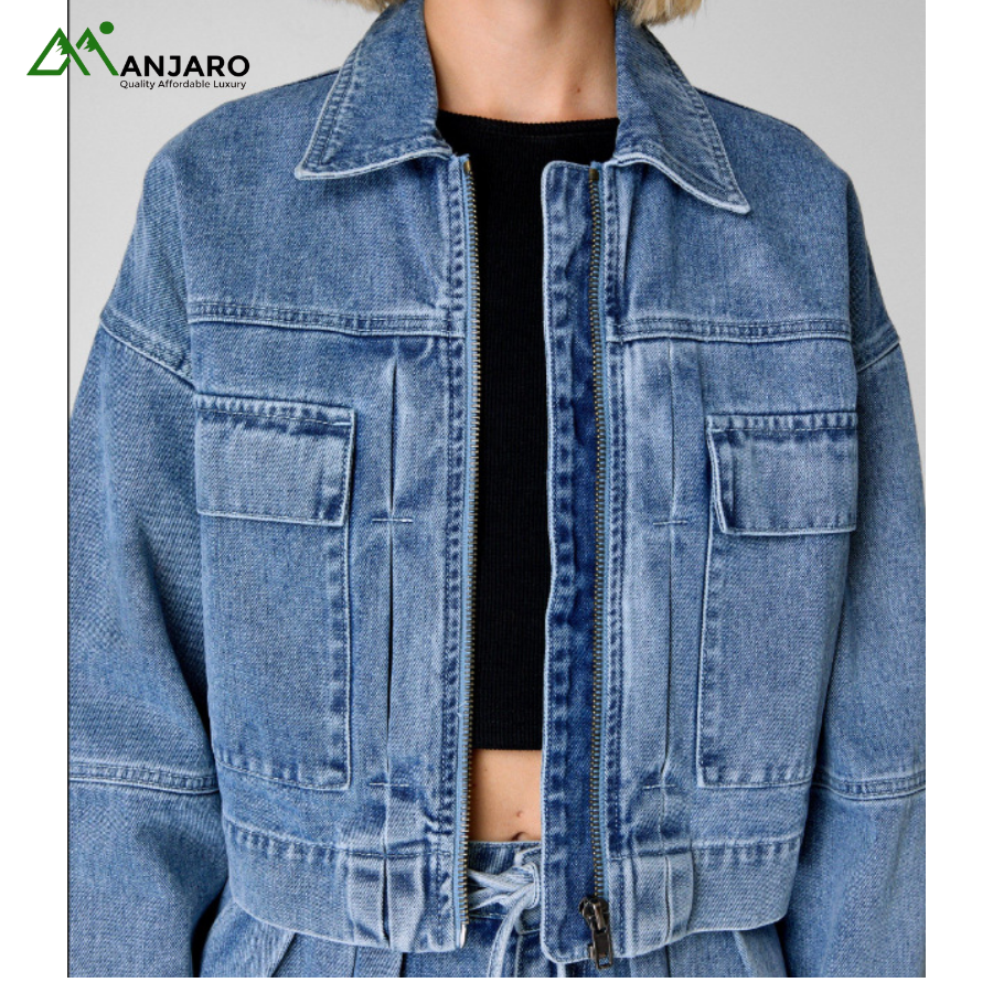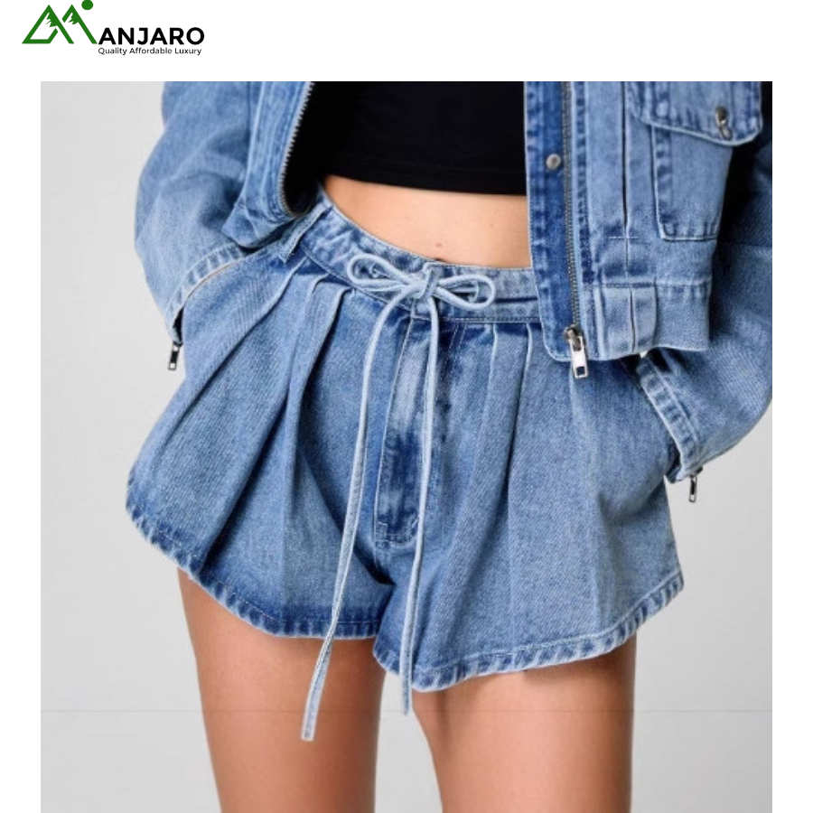 Crafted from a breathable spandex–cotton denim blend, this outfit delivers the perfect combination of flexibility, structure, and durability. The long-sleeve jacket brings a vintage touch with its clean solid finish and functional pockets, while the A-line high-waist denim shorts offer a slimming silhouette for an instantly flattering shape.
