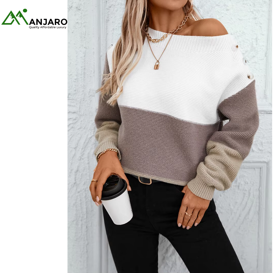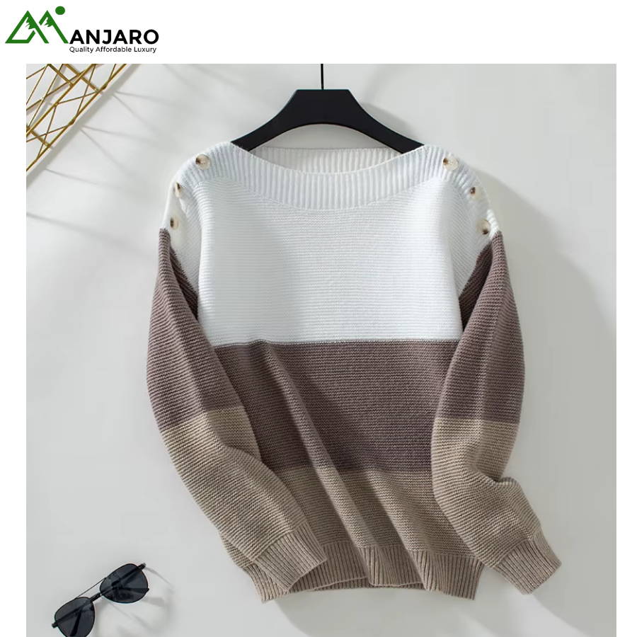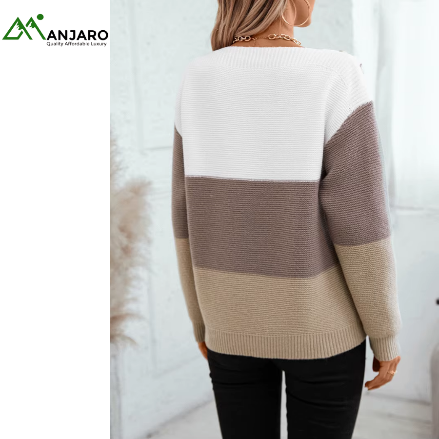 Designed with a drop shoulder, O-neck, and long loose fit, it offers effortless style while ensuring freedom of movement. The contrast stripes and tie belt detail at the back add a modern touch to this classic knitted design, making it versatile for pairing with jeans, skirts, or trousers.