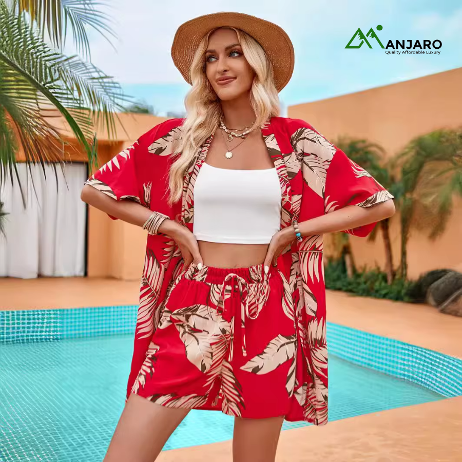 Elevate your vacation wardrobe with the D&M Factory Women’s Casual Printed Cardigan & Shorts Suit Set a breezy, fashionable two-piece crafted for relaxed yet stylish summer days.