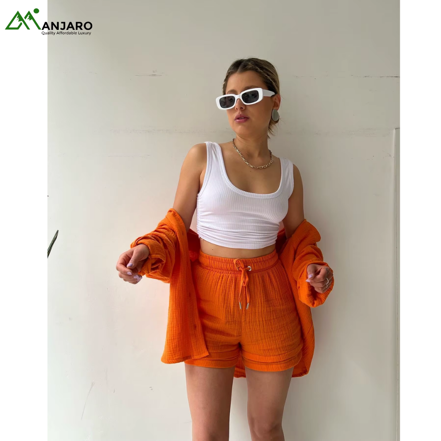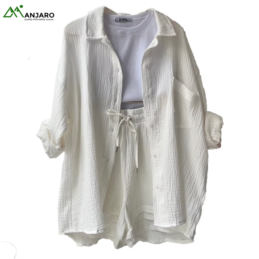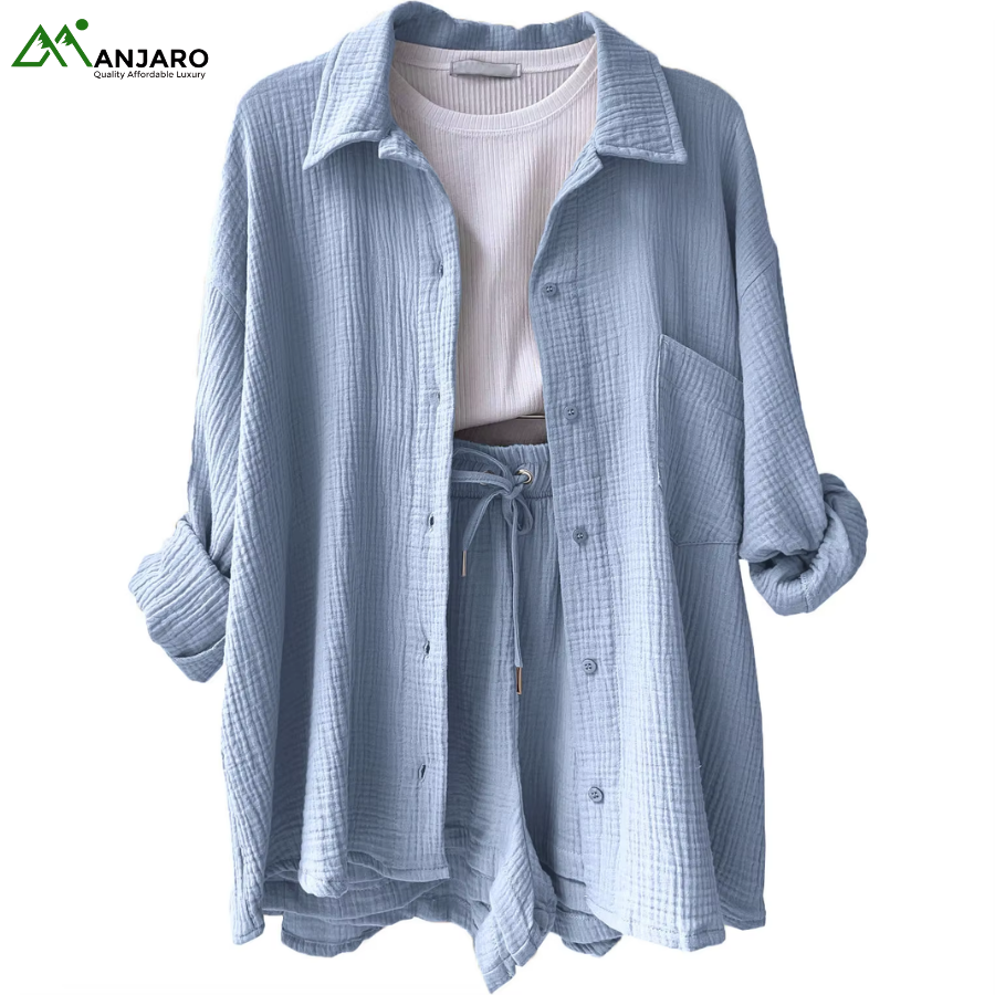 Crafted from a premium 65% cotton and 35% polyester knitted fabric, the set is breathable, eco-friendly, and quick-drying, ensuring you stay comfortable and stylish all day long. The shorts feature a high-waisted design with a drawstring for a customizable fit, while the shirt provides a relaxed yet polished look, ideal for casual outings, brunches, or summer vacation wear. With functional pockets and garment-dyed detailing, this set is both practical and effortlessly trendy.