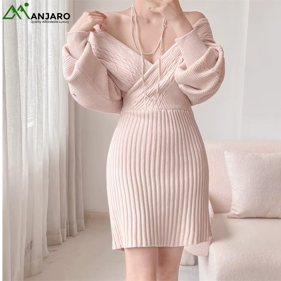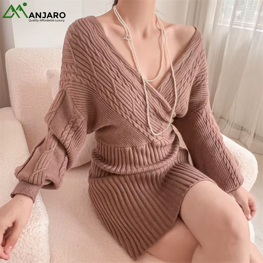 Featuring a sexy V-neck cross collar, open shoulder design, and hip underlay, it balances elegance with relaxed comfort. The thick computer-knitted fabric provides a structured yet flexible fit, while anti-shrink, anti-wrinkle, and breathable properties ensure it maintains its shape and comfort season after season.