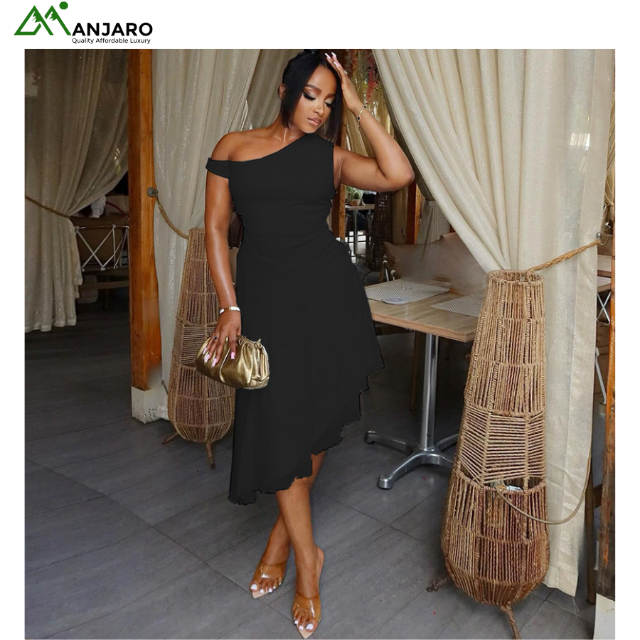 The off-shoulder asymmetrical neckline adds a touch of contemporary allure, while the irregular midi skirt drapes beautifully for a fluid, body-flattering silhouette. Designed for women who love chic simplicity and subtle drama, it’s perfect for date nights, art gallery events, or modern city evenings.