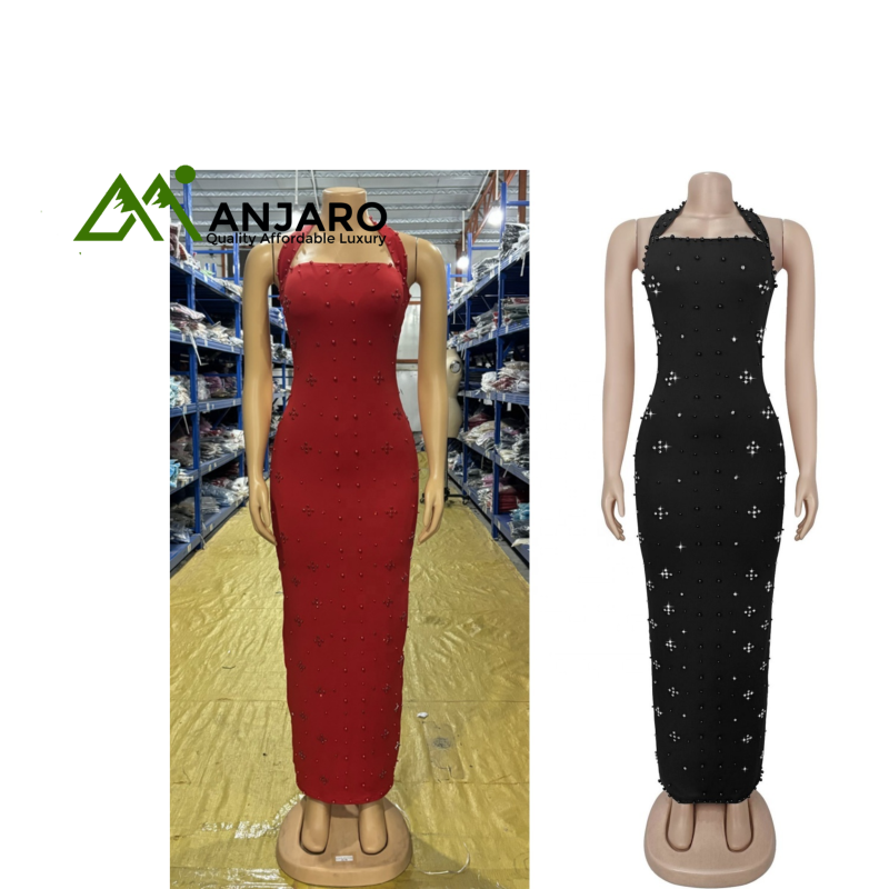 Luxurious beaded maxi halter dress with lantern sleeves for unforgettable evenings.