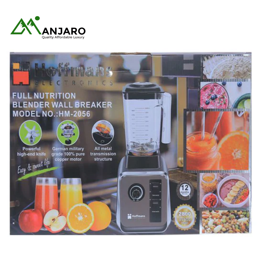 The Hoffmans Full Nutrition Blender Wall Breaker HM-2056 is built for ultimate blending performance and durability. Designed with a German military-grade 100% pure copper motor and all-metal transmission structure, this blender delivers unmatched power for smoothies, soups, juices, and nut butters. Its high-end stainless steel blades can crush ice, nuts, and frozen fruits effortlessly—making it a must-have kitchen companion for home chefs and health-conscious users alike.