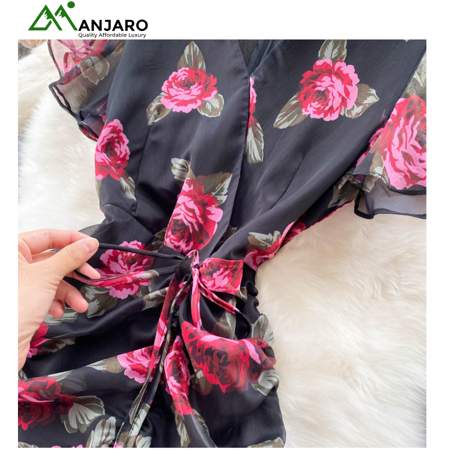 The vibrant floral pattern adds a romantic touch, while the delicate ruffle details and fishtail hemline create graceful movement with every step. Its V-neckline enhances your neckline beautifully, making it perfect for brunches, evening outings, or elegant summer occasions.
