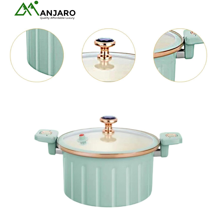 It includes a clear tempered glass lid with a decorative copper/gold-toned handle and a vent, allowing you to monitor your food as it cooks. The pot's electric function provides portability and fast heating, while the non-stick interior (implied for an electric pot) ensures effortless cleanup. This multi-cooker empowers culinary self-discovery and helps the community enjoy convenient, stylish cooking with quality affordable luxury.