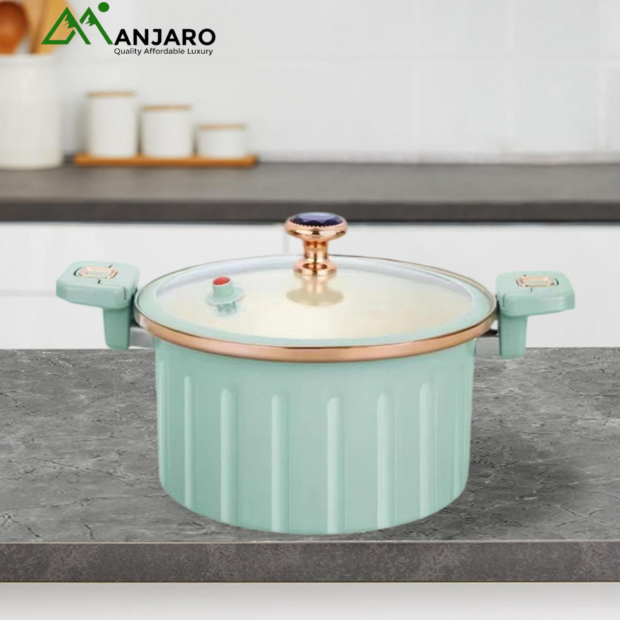 Color/Design: Distinctive Mint Green ribbed exterior with contrasting Gold/Copper-Toned accents.
