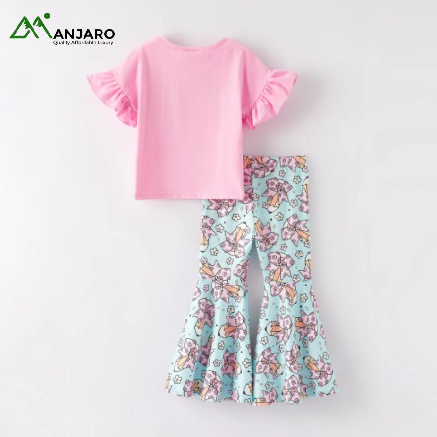 Make back-to-school stylish and comfortable with this RTS Kids Girls Summer Outfit. Crafted from a soft polyester-cotton blend, the set includes a printed pink cotton shirt adorned with a cute bow and matching flare pants for easy movement. Breathable and gentle on delicate skin, this outfit is perfect for school, casual outings, or playdates. The vibrant print and playful flare pants add a touch of fun, combining practicality with trendy design for little fashionistas.
