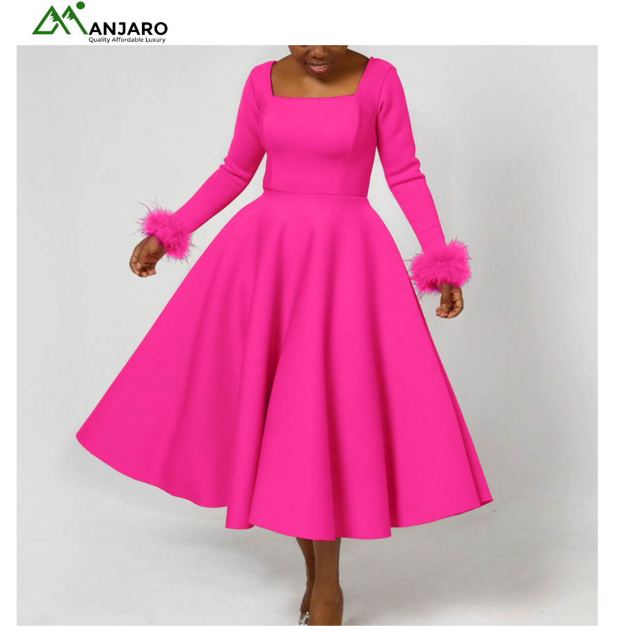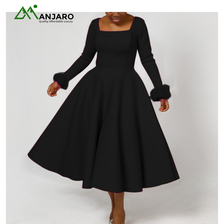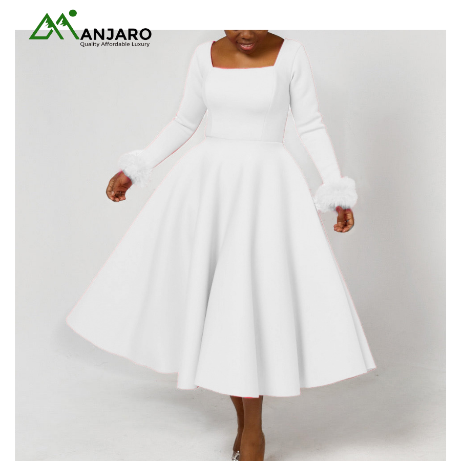 The square neckline and fitted bodice flow gracefully into a full, flared skirt, enhanced with subtle fur trimming that adds a touch of winter opulence. The long sleeves and high waistline flatter your figure while offering warmth and refinement for cooler months.
