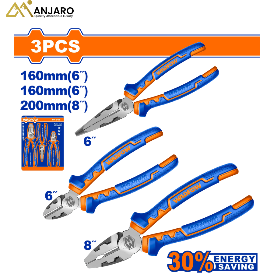 The set includes 8" high leverage combination pliers, 6" high leverage diagonal cutting pliers, and 6" high leverage long nose pliers, covering gripping, cutting, bending, and precision tasks with ease. Thanks to its high-leverage design, each tool delivers up to 30% energy savings compared to standard pliers, reducing hand fatigue during extended use.