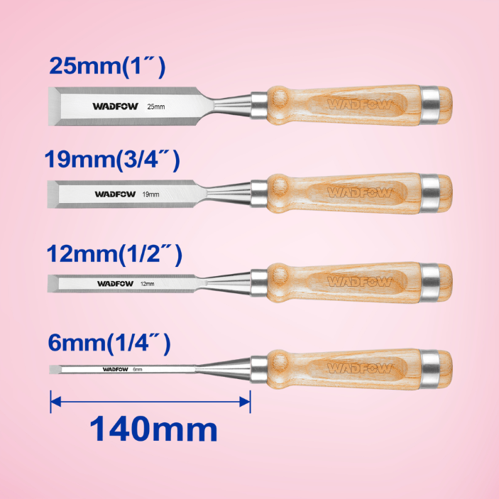 Upgrade your woodworking toolkit with the Wadfow WWC3214 4 Pcs Wood Chisel Set—designed for craftsmen who demand precision and strength. This versatile set includes four chisels of different widths, allowing you to tackle everything from detailed carving to robust trimming. Each chisel features a hardened steel blade for long-lasting edge retention and an ergonomically designed handle for comfort during prolonged use. Perfect for furniture making, joinery, and general carpentry, this set is a reliable companion for both beginners and professionals.