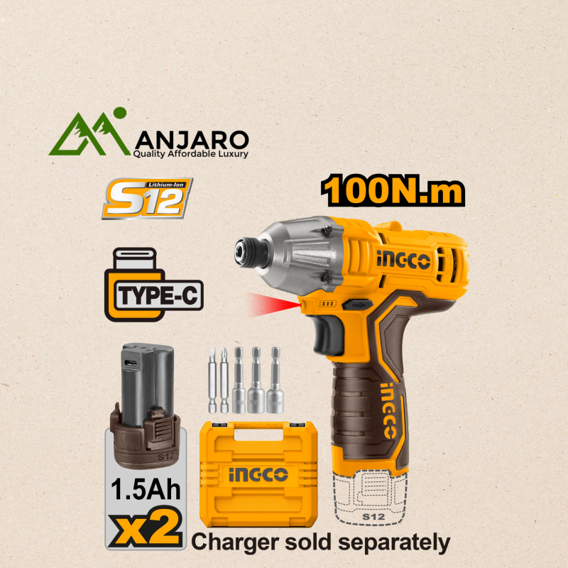 The Ingco CIRLI12015 Cordless Impact Driver is built to deliver high torque and efficient fastening for various applications. Powered by a 12V system, it achieves a maximum torque of 100Nm with a no-load speed of 0–2000rpm and an impact rate of 0–2800bpm, making it ideal for driving screws and bolts quickly and precisely. The driver features a standard 6.35mm (1/4") hex shank for easy bit changes and includes an integrated LED work light for better visibility in dark areas. This set comes complete with 2 screwdriver bits, 3 nut setters, two 1.5Ah battery packs, and a convenient USB Type-C charging port, all neatly packed in a durable carrying case. Perfect for both DIY enthusiasts and professionals seeking cordless freedom and reliable power.