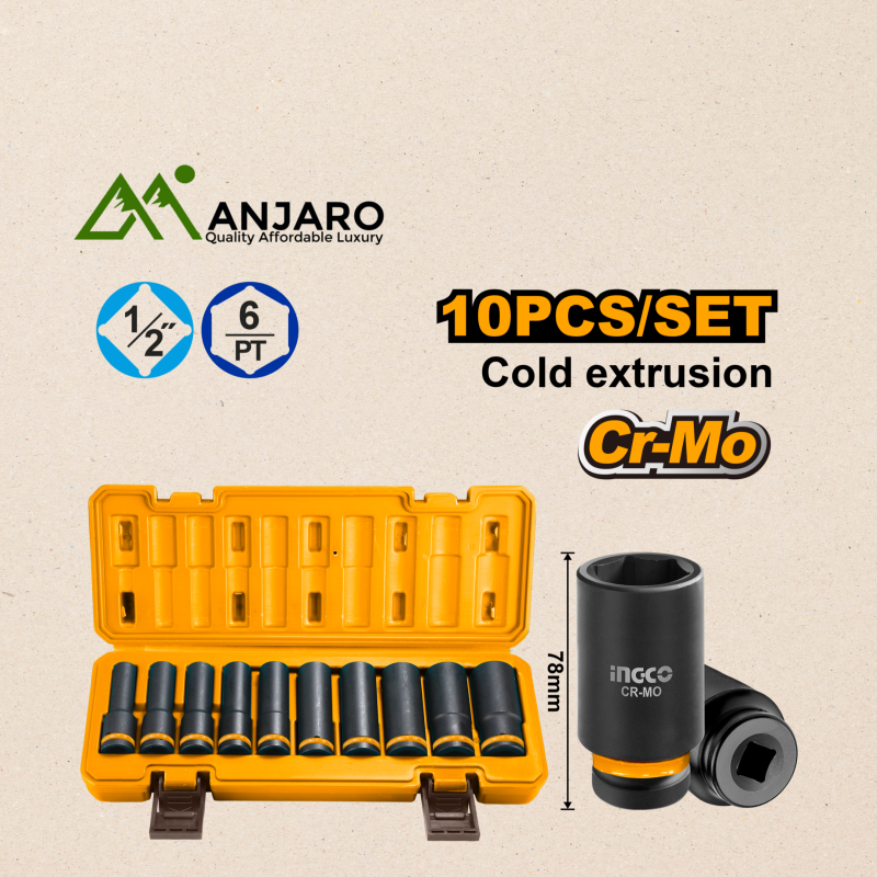 The Ingco HKISSD12102L 10-Piece Deep Impact Socket Set is built for heavy-duty fastening, offering durability and strength for professional workshops and demanding DIY projects. Each socket in the set is crafted from high-quality Cr-Mo steel using cold extrusion and heat treatment processes, ensuring resilience under high torque applications. The 1/2" drive sockets come in commonly used sizes, ranging from 10mm to 24mm, with a 78mm length designed for deep access in tight or recessed areas. The set is neatly packed in a sturdy plastic box for organized storage and easy portability, making it an essential addition to your mechanical tool collection.