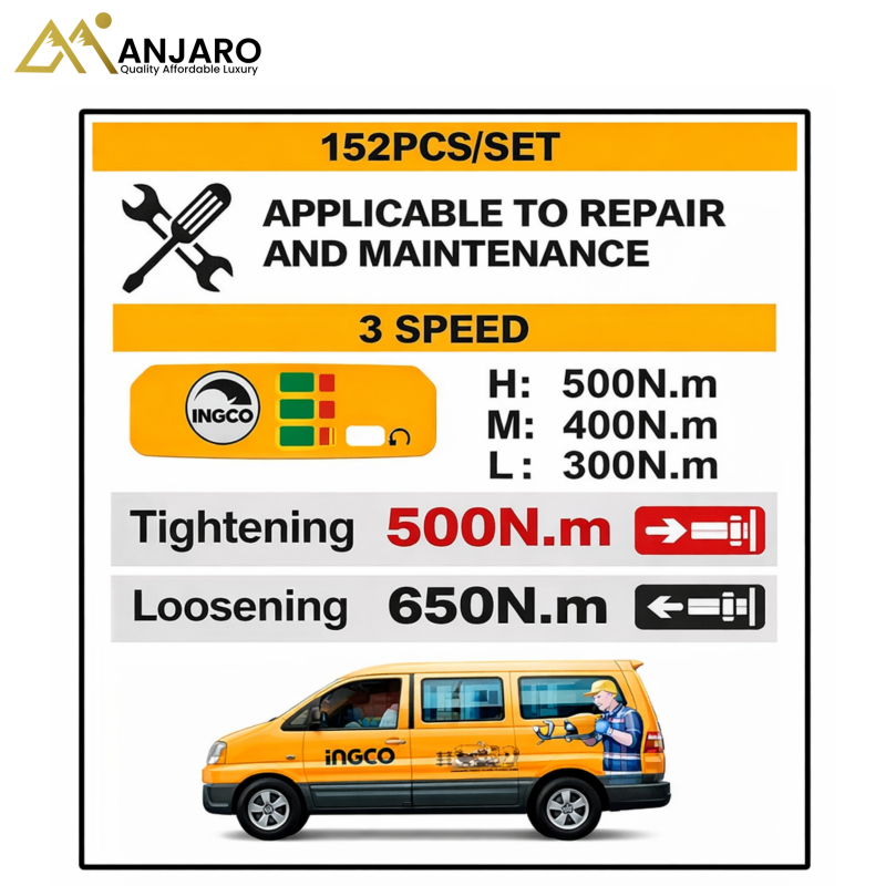 Step into professional-grade performance with the INGCO HKTHP31521 Cordless Impact Wrench Tools Set, a complete 152-piece solution designed for mechanics, technicians, and serious DIY users. This all-in-one kit combines power, precision, and versatility, making it ideal for automotive repairs, equipment maintenance, and heavy-duty fastening tasks.