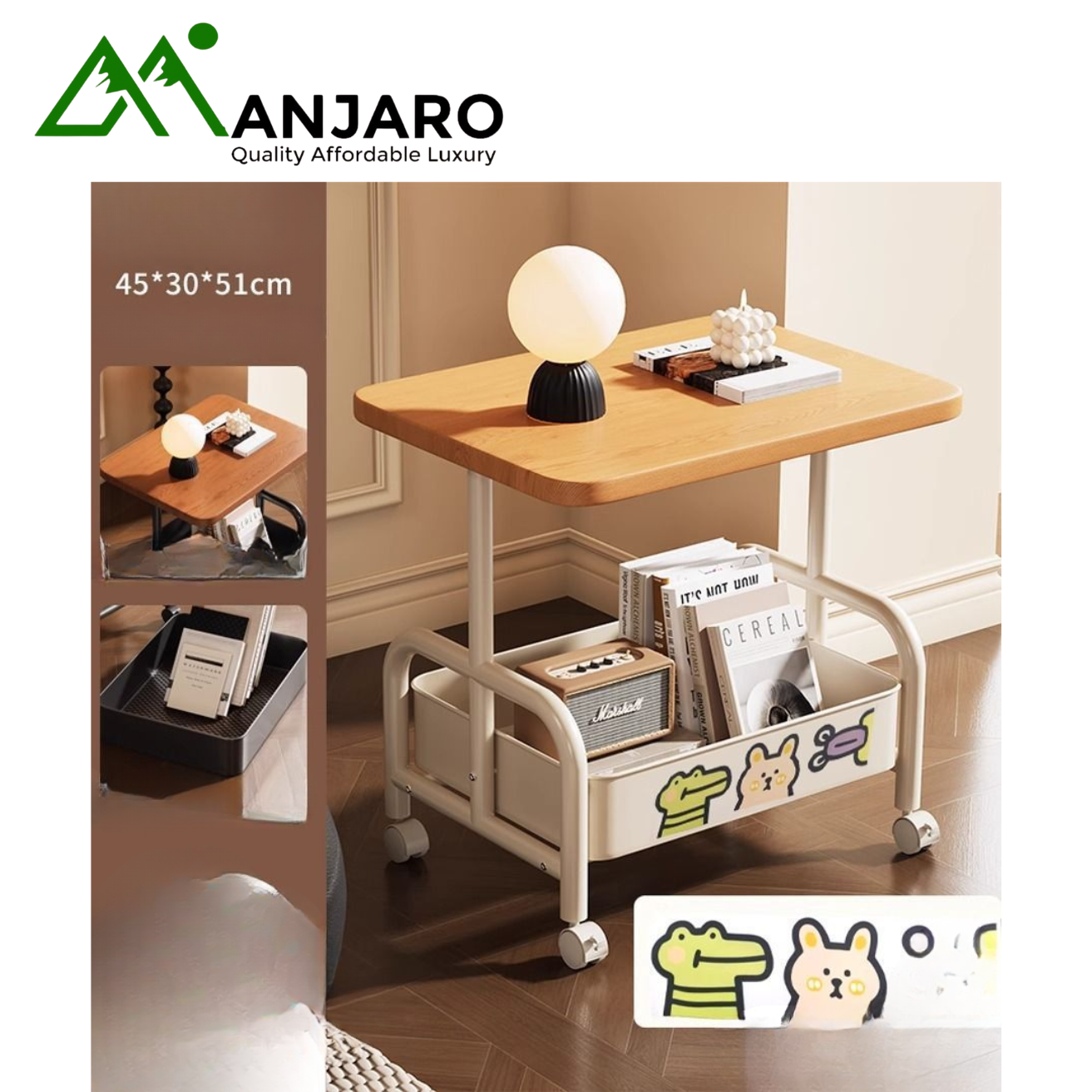 With upgraded swivel wheels, the table glides smoothly across any surface, making it easy to reposition beside your sofa, bed, or reading chair. Its compact yet spacious structure includes storage space, allowing you to organize essentials like books, remotes, cups, or decorative pieces.