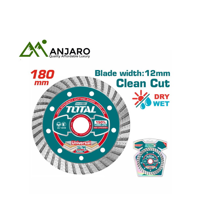 The Total TAC2131803 Turbo Diamond Disc is designed for fast, clean, and efficient dry cutting of concrete, granite, marble, tile, and other tough materials. Its continuous rim turbo design ensures a smoother finish with reduced chipping, while delivering superior cutting speed and durability.