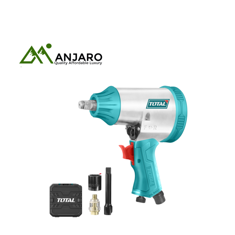 The Total TAT41125 Air Impact Wrench Set is your all-in-one solution for high-performance fastening and loosening tasks. Designed with a 1/2-inch square drive and a free speed of 7000 RPM, the impact wrench delivers powerful torque while maintaining control and precision. This complete set includes a selection of commonly used sockets, extension bars, and accessories, all housed in a convenient carry case. Whether you're working in a garage, service center, or home workshop, the TAT41125 set ensures you're equipped for everything from tire changes to mechanical repairs. Built for durability, efficiency, and ease of use, it’s the perfect choice for professionals and DIYers alike.