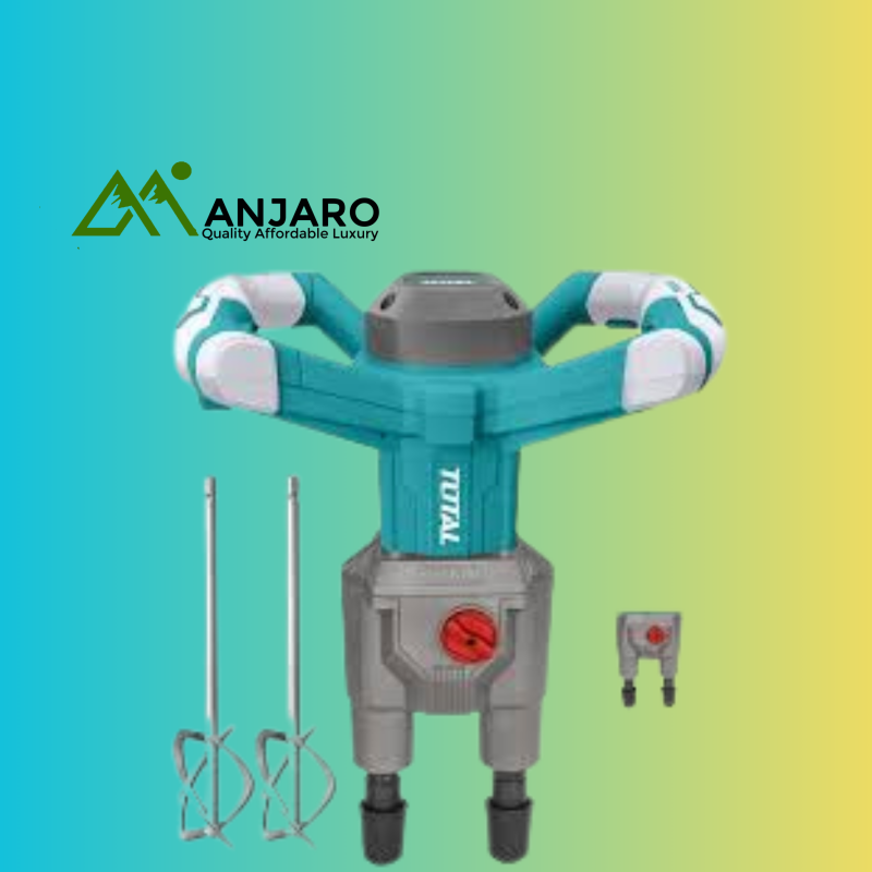 The Total TD616006 Electric Mixer is a heavy-duty mixing solution designed for professionals in construction, renovation, and workshop environments. Powered by a robust 1800W motor, it delivers two variable speed ranges (180–480rpm / 250–680rpm) for efficient mixing of mortar, plaster, paint, adhesives, and other compounds. Its aluminum gearbox ensures durability, while the twin paddles with quick fix system provide faster setup and superior blending performance. Complete with two mixing pads and an extra set of carbon brushes, this mixer is built for power, precision, and long-term reliability.