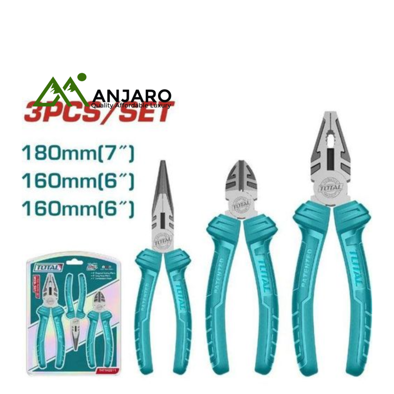 Level up your toolbox with the Total THT1K0311 3 Pcs Pliers Set, built for strength, precision, and daily use. This essential hand tool kit features a combination plier, a diagonal cutting plier, and a long nose plier—each engineered from hardened carbon steel for maximum durability and performance. Whether you're repairing electronics, assembling furniture, or fixing plumbing, these ergonomic tools deliver a firm grip and clean cuts every time. A must-have for DIYers, electricians, and technicians who value efficiency and control.
