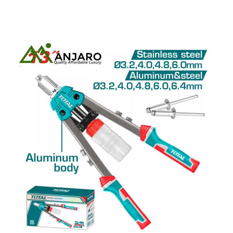 The Total THT32131 Hand Riveter is a tough, easy-to-use fastening tool designed for reliable performance across various materials like metal, plastic, and leather. Whether you're fixing gutters, assembling metal frames, or crafting home repairs, this manual riveter offers strong riveting power with minimal effort. Its compact design and durable steel frame ensure precision even in tight spaces, while the non-slip handle offers comfort and control during extended use.