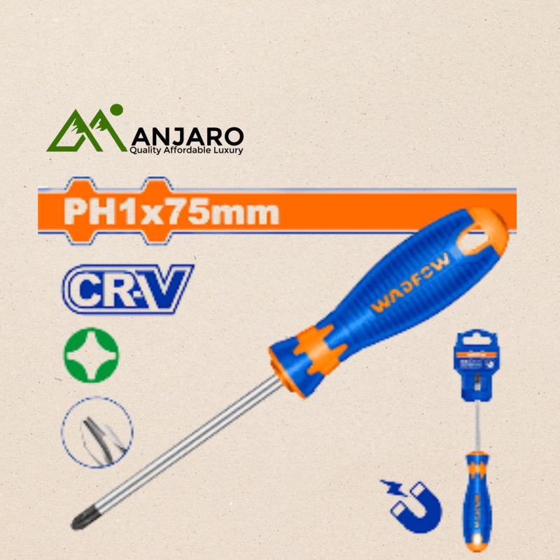he Wadfow WSD2213 Phillips Screwdriver is crafted for precision, comfort, and durability, making it an essential tool for any workshop or household. Featuring a PH1 tip and a 75mm round shank, this screwdriver is ideal for electronics, small appliances, and detailed fastening tasks. The Cr-V steel construction offers excellent strength, while the black-finished blade and magnetized tip ensure accurate screw placement. Its ergonomic soft grip handle reduces hand fatigue, providing superior control during use.