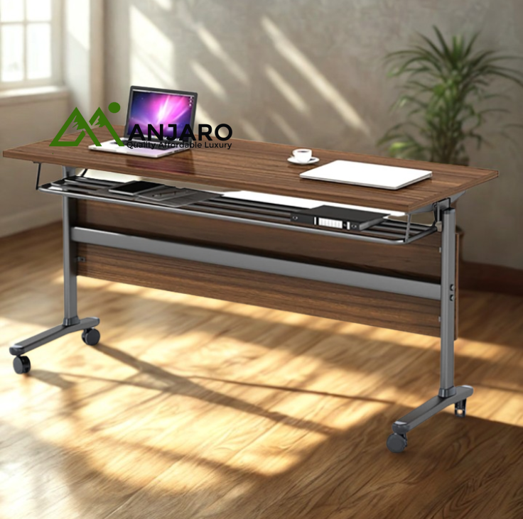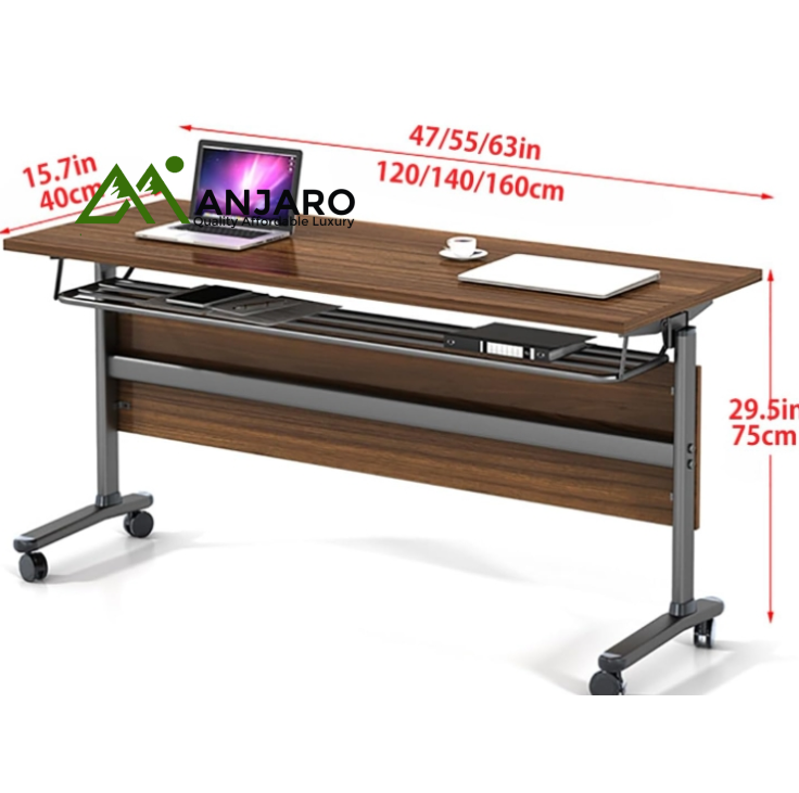 Upgrade your workspace with this sleek folding computer desk, designed for flexibility, durability, and style. Available in three lengths—120cm, 140cm, and 160cm—this multifunctional desk fits a variety of office, study, or conference setups. It features a warm wood grain finish, foldable steel frame, smooth-rolling wheels for mobility, and a spacious under-desk shelf for cable management or accessory storage. The desk folds flat when not in use, making it ideal for compact spaces or temporary setups.