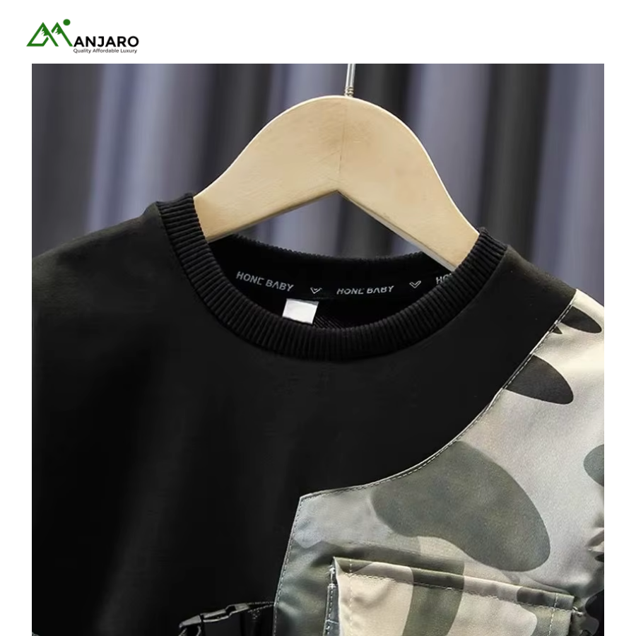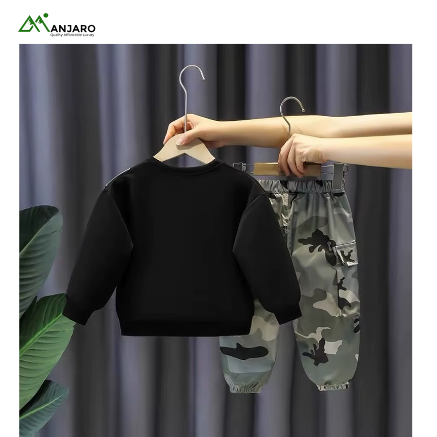 The camouflage pattern delivers a bold, trendy street-sport look, while the worsted fabric ensures a smooth, premium feel against the skin. Ideal for school, outings, activities, or relaxed weekends, this matching set keeps boys stylish and comfortable in every season.