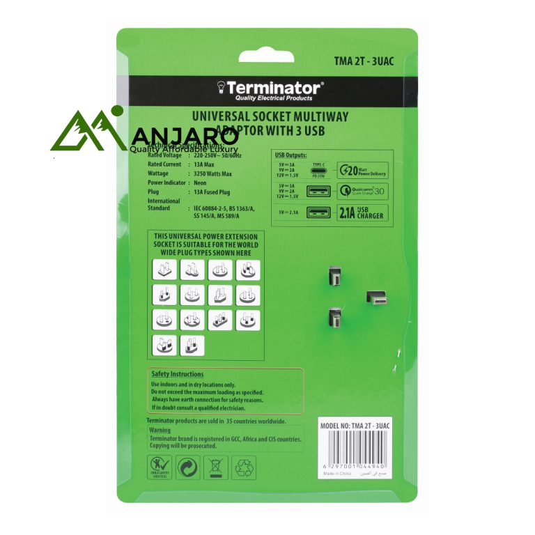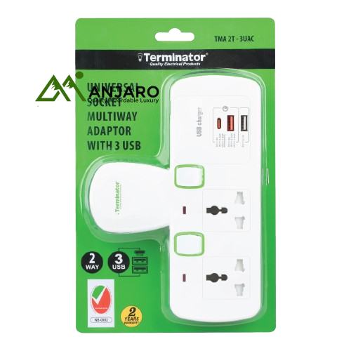 Power up smarter with the Terminator TMA 2T-3UAC Multi Adaptor – your all-in-one charging and power distribution solution. Designed for modern households and workspaces, this adaptor features 3 universal T-sockets and 3 high-speed USB ports (including Type-A and Type-C), allowing you to charge and power multiple devices simultaneously.