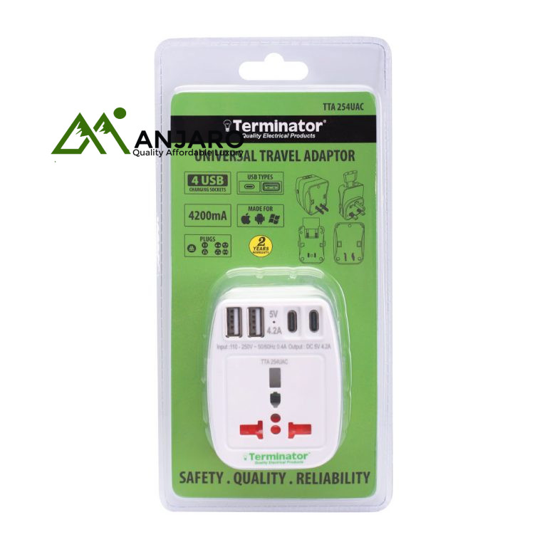 Stay powered anywhere in the world with the Terminator TTA 254UAC Multipin Universal Travel Adaptor – your ultimate travel companion for charging multiple devices on the go. Equipped with 4 USB ports (2 x USB-A and 2 x USB-C) with a combined output of 4200mA, this compact adaptor ensures your gadgets stay charged whether you're at the airport, in a hotel or abroad.