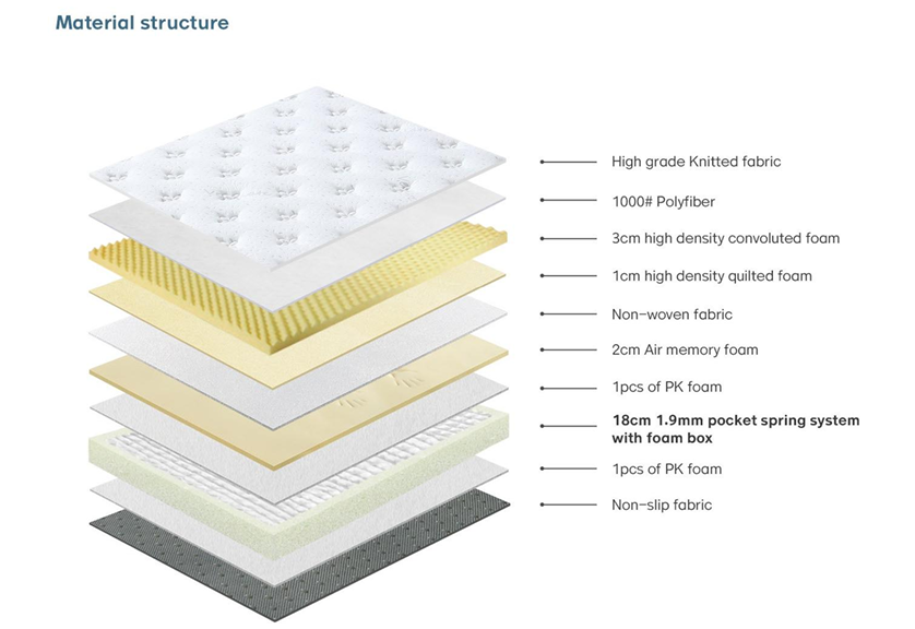 Introducing the TM2303A Premium Mattress, designed with thoughtful layering and a foam box structure that delivers firm support and cloud-like comfort. Crafted with high-grade knitted fabric, air memory foam, and a foam-encased 1.9mm pocket spring system, this mattress provides durable structure and motion isolation while adapting to your body's pressure points.