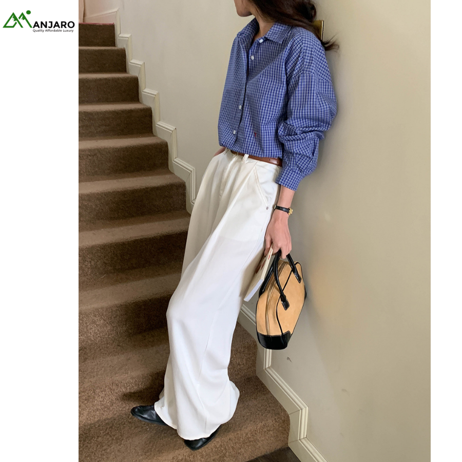 Design: High-waisted, slightly floor-length, wide-leg pants