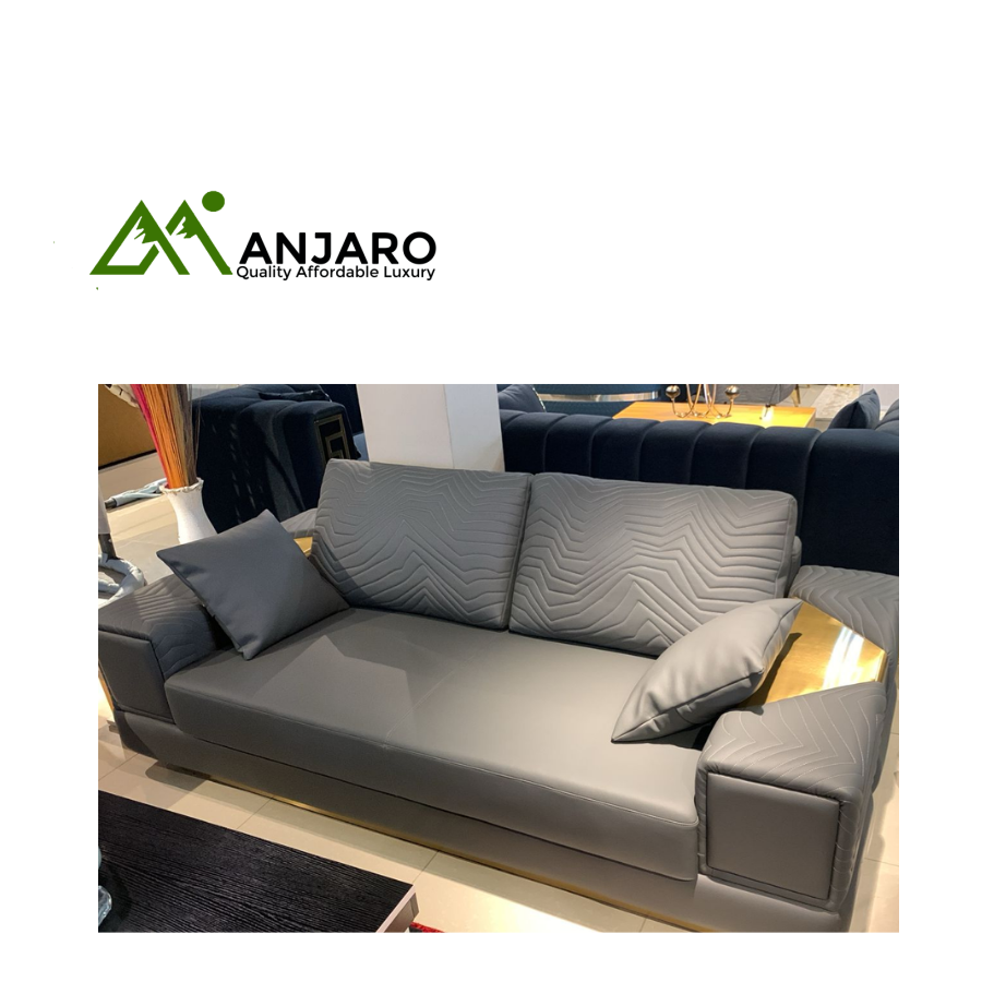 Make a powerful statement with the Velocity Edge Sectional Sofa Set. This sleek, dynamic collection is designed for the modern, forward-thinking home or executive office, blending high-end design with uncompromising comfort. The set is upholstered in a premium, durable dark grey leatherette, featuring a distinctive angular stitch pattern on the back and arm cushions for a refined, modern texture. Its most striking features are the bold gold metallic side panels integrated into the arms and the gold trim at the base, creating a luxurious, empowered aesthetic. The sectional configuration provides generous seating, while the wide armrests offer functional space. The Velocity Edge set is a must-have for building a community space that inspires connection and elevated style.