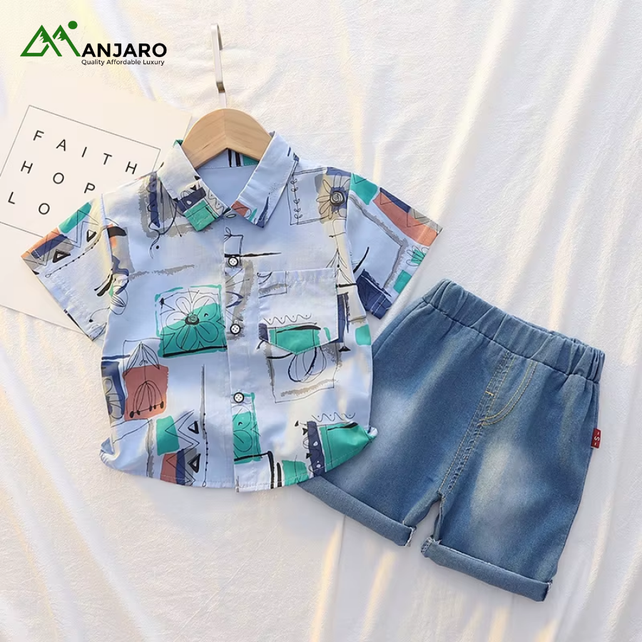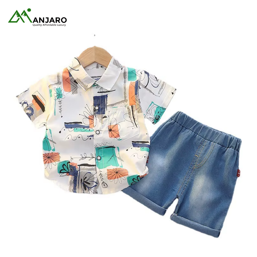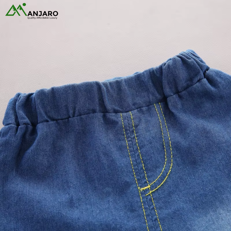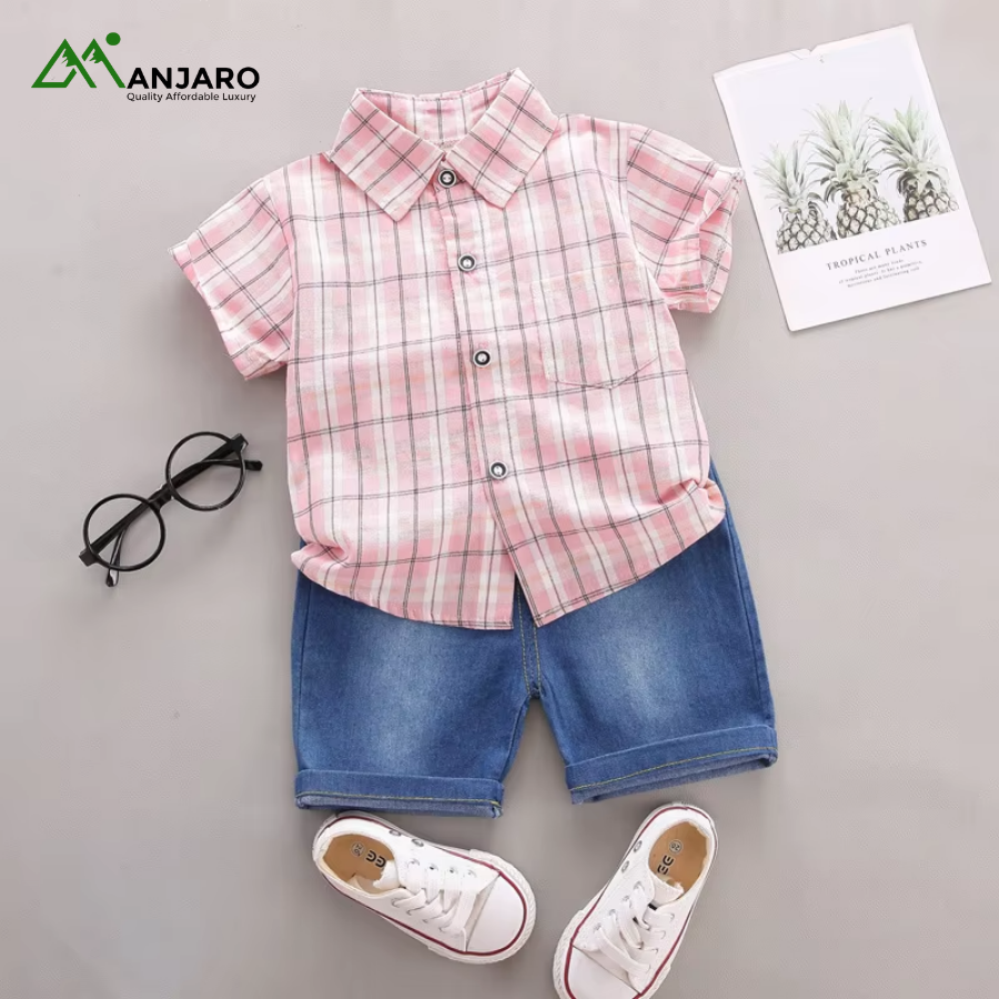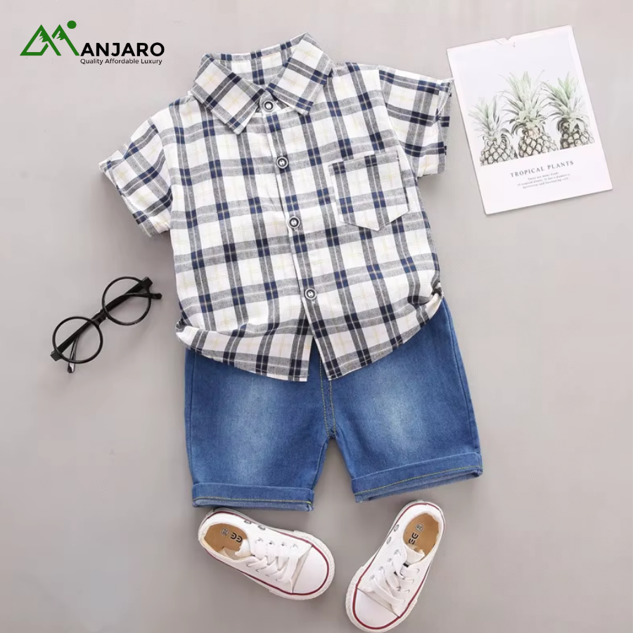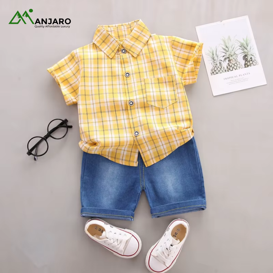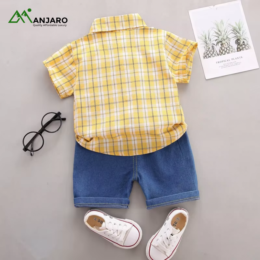 The elastic waistband on the denim shorts ensures a snug, adjustable fit, while the plaid top adds a classic, stylish touch. Lightweight and durable, this set is perfect for toddlers who love freedom of movement without compromising style. Ideal for wholesale buyers, boutique owners, or parents seeking versatile casual outfits for young boys.